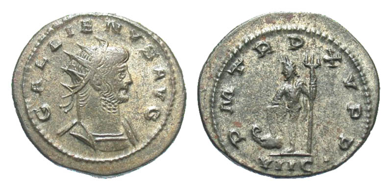 Gallienus. A.D. 253-268. BI antoninianus (21.7 mm, 3.92 g, 5 h). Antioch mint, Struck A.D. 263-264. Scarce type. GALLIENVS AVG, radiate and cuirassed bust right / P M TR P XV P P / VIIC ·, Neptune standing left, foot on prow, holding trident. Göbl 1638b; RIC 603; RSC 848. gVF, choice, fully silvered.