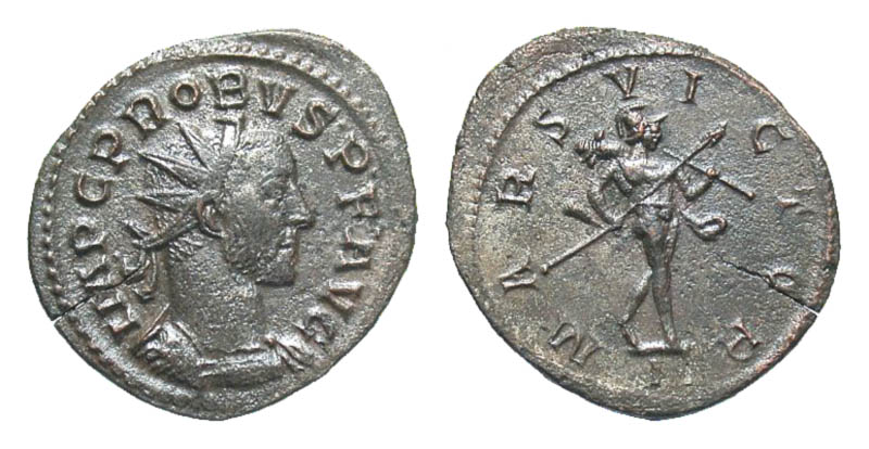 Probus. A.D. 276-282. Æ antoninianus (23.5 mm, 3.56 g, 1 h). Lugdunum mint, Struck A.D. 277. IMP C PROBVS PF AVG, radiate and cuirassed bust right / MARS VICTOR, Mars advancing right, holding spear and trophy; II in exergue. RIC 38; Bastien 191. VF, partially silvered, flan crack.