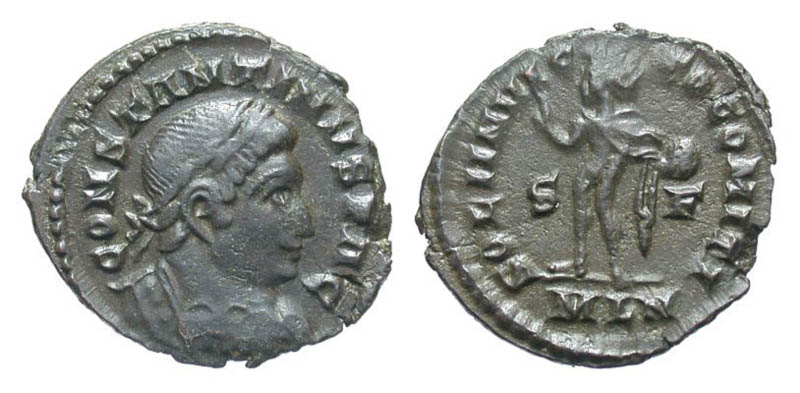 Constantine I. A.D. 307/10-337. Æ follis (21.7 mm, 2.95 g, 6 h). London mint, Struck A.D. 315-316. Rare. CONSTANTINVS AVG, laureate and cuirassed bust right / SOLI INVICTO COMITI, Sol standing left, chlamys across left shoulder, holding globe, right hand raised; S-F in fields, MLN in exergue. RIC 47. VF.