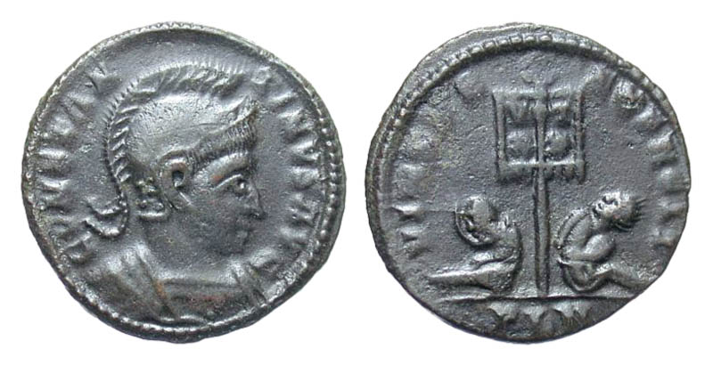 Constantine I. A.D. 307/10-337. Æ follis (19.2 mm, 2.58 g, 6 h). London mint, Struck A.D. 320-321. CONSTANTINVS AVG, helmeted and cuirassed bust right / VIRTVS EXERCIT, two captives seated between banner with VOT/XX; PLN in exergue. RIC 191. aVF.
