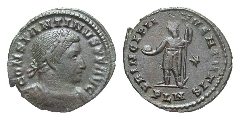 Constantine I. A.D. 307/10-337. Æ follis (23.9 mm, 5.12 g, 6 h). London mint, Struck A.D. 310-312. Scarce. CONSTANTINVS PF AVG, laureate and cuirassed bust right / PRINCIPI IVVENTVTIS, prince standing left holding globe and spear, star in right field; PLN in exergue. RIC 222. VF.