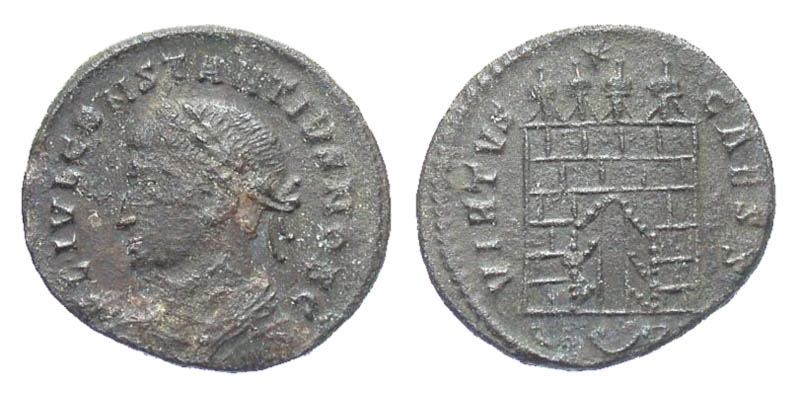 Constantius II. As Caesar, A.D. 324-337. Æ 3 (19.0 mm, 2.62 g, 6 h). Arelate mint, Struck A.D. 325-326. FL IVL CONSTANTIVS NOB C, laureate, draped, and cuirassed bust left / VIRTVS CAESS, campgate with four turrets, one star above, with open doors; QA crescent RL in exergue. RIC 297; LRBC 299. aVF, rough surfaces.