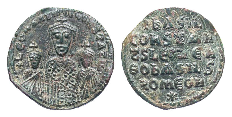 Basil I, the Macedonian. 867-886. Æ follis (24.9 mm, 5.08 g, 6 h). Constantinople mint, Struck 870-879. + LЄOn ЬAS COnSτ AЧςς, crowned half-length facing busts of Basil, wearing loros and holding akakia, between Leo and Constantine, each wearing chlamys / + ЬASIL/COnSτAn/τ S LЄOn Єn/Ó¨O ЬASILS/ROmЄOn, legend in five lines, star below. SBV 1712; DOC 11. VF, bent flan.