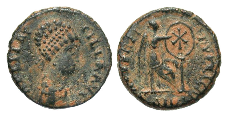 Aelia Flaccilla. Augusta, A.D. 379-386/8. Æ 4 (12.7 mm, 1.47 g, 11 h). Antioch mint, Struck A.D. 383-388. AEL FLACCILLA AVG, pearl-diademed and draped bust right / SALVS REIPVBLICAE, Victory seated right, inscribing Chi-Rho onto shield set on column, ANTE in exergue. RIC 54; LRBC 2737. gVF, red patina.