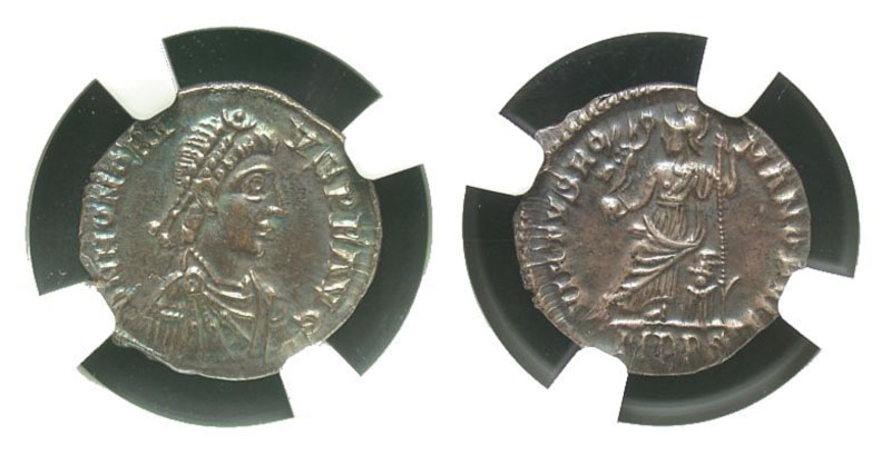 Lot 28-124. Honorius. A.D. 393-423. AR siliqua. Mediolanum mint, Struck A.D. 393-394. NGC Certified.