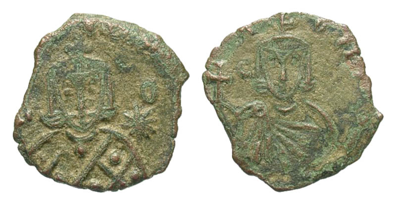 Leo V, the Armenian. 813-820. Æ Follis (20.5 mm, 2.52 g, 6 h). Syracuse mint. Λ-ЄO, facing bust of Leo, with short beard, wearing crown and loros, and holding cross potent; star in right field / KONCT, facing bust of Constantine, beardless, wearing crwon and chlamys, and holding globus cruciger. SBV 1636; DOC 17. VF.