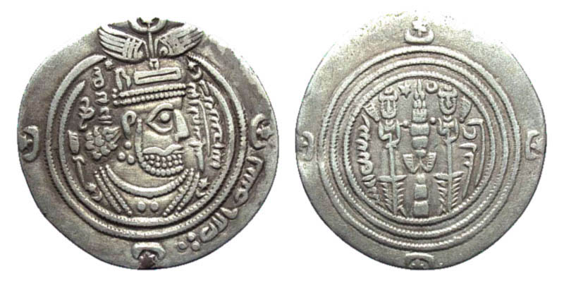 Arab-Sasanian, Umayyad Caliphate. 'Ubayd Allah b. Ziyad. 54-64/673-683. AR drachm (29.5 mm, 2.85 g, 3 h). al-Basra mint, dated A.H. 56. Crowned bust right, three stars and crescents around / Fire altar with two attendants, four stars and crescents around. Album 12. VF, toned.