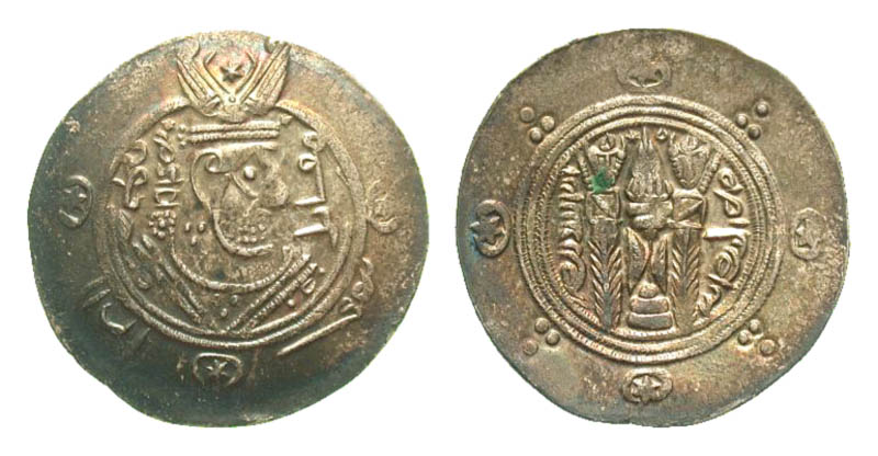 Tabaristan, Abbasid Governors. Muqatil. 788-792. AR hemidrachm (23.2 mm, 1.91 g, 11 h). AH 179, Pye 144. Scarce. Crowned Sasanian-style bust right / Fire altar flanked by attendants. Malek 124; Album 68. VF, toned.