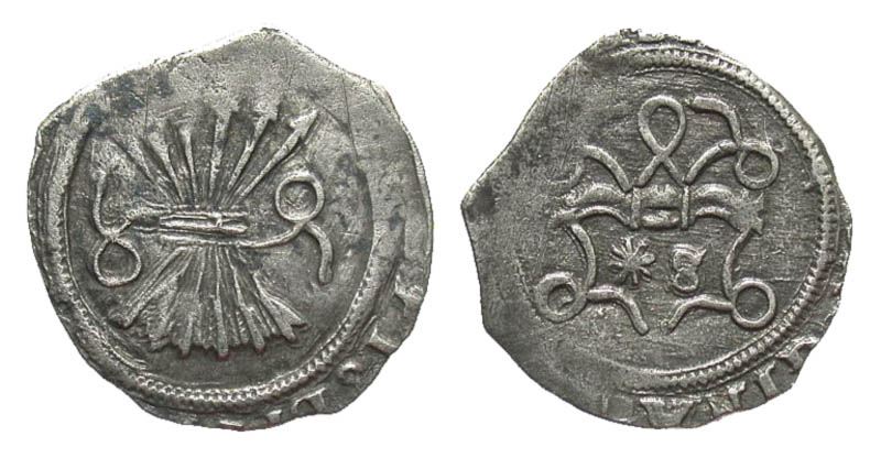 Spain, Castile and Leon. Ferdinand & Isabella. 1474-1504. AR half real (19.6 mm, 1.66 g, 3 h). Seville mint. REX ET REGINA CAS ET LEG, Garlanded yoke, B* / FERNANDVS ET HELISAB , Sheaf of arrows. VF, clipped.