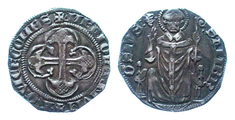 Italy, Milan. Azzo Visconti. 1329-1339. AR grosso da 2 soldi (23.8 mm, 2.56 g, 7 h). +MEDIOLANVM·+AZO:VICECOMES, ornate short cross within quadrilobe / S·AMBROSIVS:, Saint Ambrose enthroned facing, holding crozier and raising right hand in benediction. CNI 1; Crippa 2; Biaggi 1442. Toned gVF.