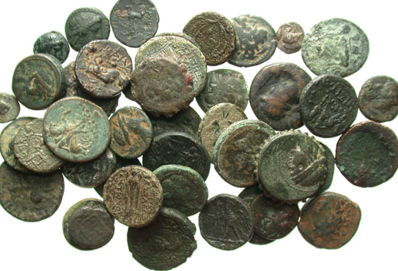 Lot of 43 Greek Bronze Coins. A nice assortment of cities from Macedon through Asia Minor, an excellent mix of types with several rarities included. Unattributed for your enjoyment! Fair-VF. Ex- Dave Surber Collection. All group lots are sold as-is, returns not accepted. The coins shown are the exact coins you will receive.