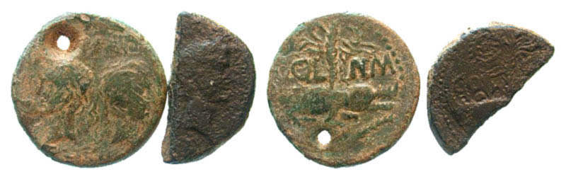 Lot of 2 Nemauseus Crocodiles. One example with a hole in it, Fine with a sandy patina. The second was cut for change, Fine.