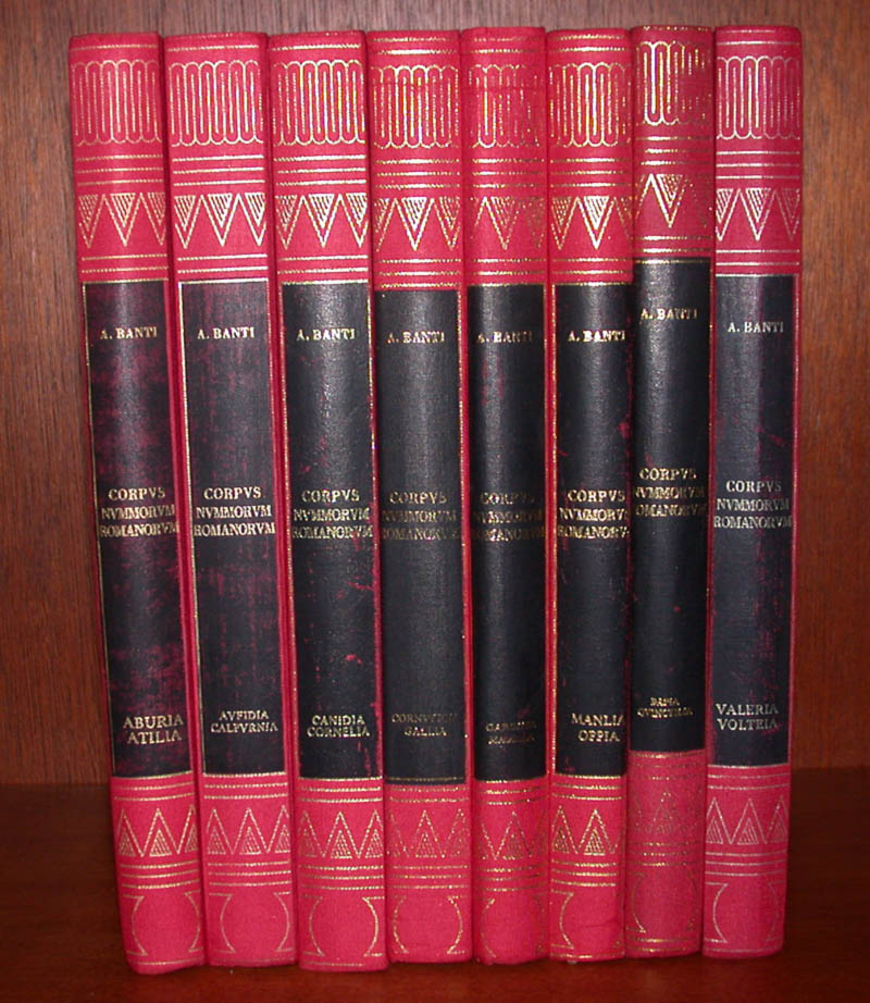 Banti; Corpus Numorum Romanorum, Complete Set- Roman Republican. 1980-1982 reprints. No dust jackets. Spines are firm. The pages have some yellowing but are crisp.(Volume Renia-Tvllia not shown but is included. Same condition as the other volumes in the photo)This is a very heavy set of books. Shipping within the US will be via media mail, international mail may prove to be very expensive. Please contact me for international rates before bidding.