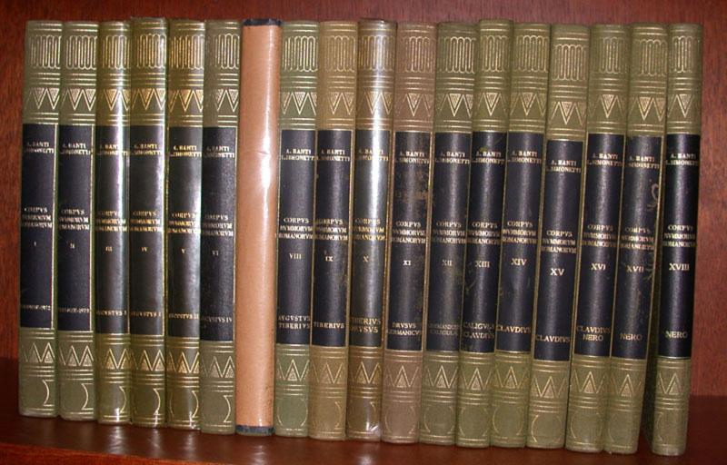 Banti-Simonetti; Corpus Numorum Romanorum, Complete Set- Roman Imperial. 1972-1979. Covers the periods of the Imperators through Nero. Some with dust jackets, some without, one with a home made dust jacket. Spines are firm. The pages have some yellowing but are crisp. This is a very heavy set of books. Shipping within the US will be via media mail, international mail may prove to be very expensive. Please contact me for international rates before bidding.