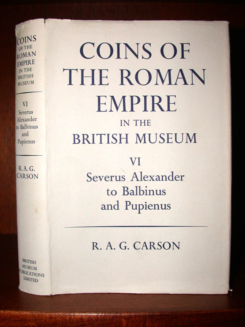 Coins of the Roman Empire in the British Museum; VI, Carson. From Severus Alexander to Balbinus and Pupienus. 1976 reprint. 311 p. with 47 plates. Some staining on the dust jacket but the interior is pristine.