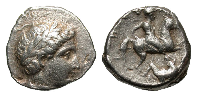 KINGDOM OF PAEONIA. Patraos, 335-315 BC. AR Tetradrachm (12.78 gm). Laureate head of Apollo / Cavalryman spearing fallen enemy. PaeonianHoard.198. Toned VF. ex Frank James collection. [Est. $475.]