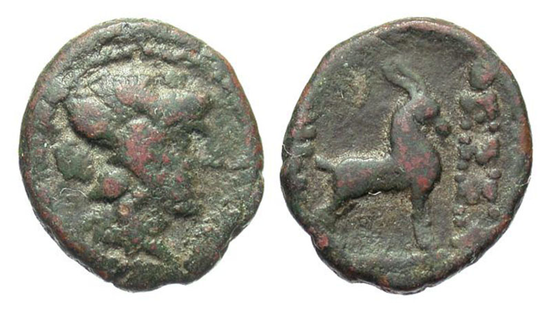 MACEDONIA, Thessaloniki. 187-31 BC. AE19 (5.05 gm). Head of Dionysos in ivy-wreath / Goat standing. SNG.Cop.365. Fine+, red brown patina. Ex H. Wallace coll. [Est. $95.]