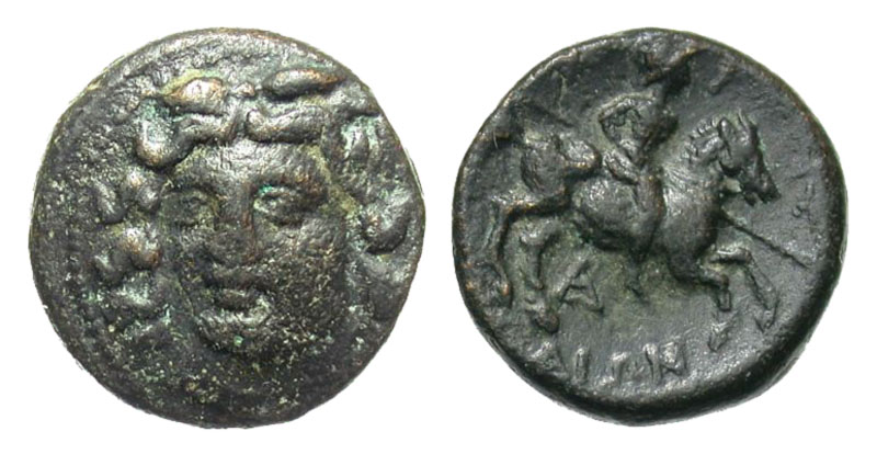 THESSALY, Larissa. III Century BC. AE19 Dichalkon (5.67 gm). Head of nymph Larissa, 3/4 facing, wearing grain crown / Mounted lancer charging, monogram beneath. BCD.393.3. Rogers.284. VF, green patina. [Est. $175.]