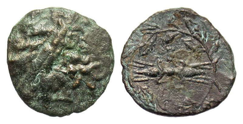 EPIRUS. Pyrrhus, 295-272 BC. AE18 (3.64 gm). Head of Zeus / Thunderbolt in wreath. SNG.Cop.102. aVF, green brown patina. Scarce. [Est. $150.]