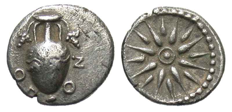 LOKRIS OPUNTIA.  338-300 BC. AR Obol (0.78 gm).  Amphora with grapes on handles / Star of sixteen rays.  SNG.Cop.57.  BMC.36.  Toned VF+.  Rare.  [Est. $475.]