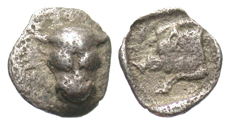 PHOKAIA, Phokis.  485-480 BC.  AR Obol (0.71 gm).  Facing head of Bull / Forepart of boar in shallow incuse square.  Williams.51.b (this coin).   Toned aVF, porosity.  ex. R T Williams collection.  [Est. $250.]