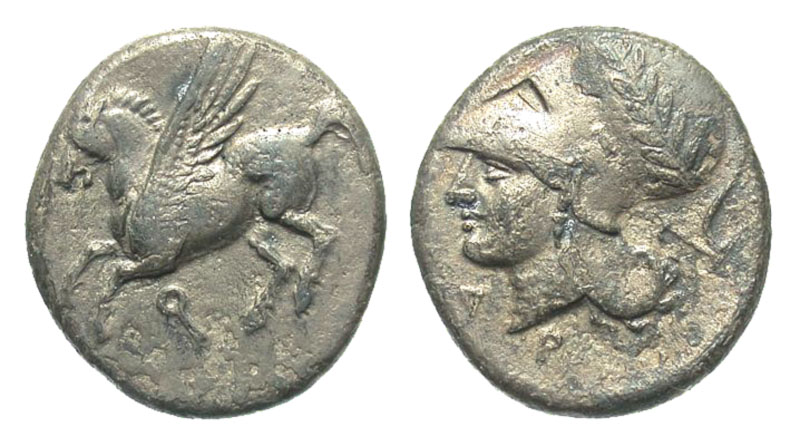 CORINTH.  345-307 BC.  AR Stater (8.53 gm).   Pegasus flying / Head of Athena wearing wreathed helmet, plough behind.  Pegasi.442.  Toned VF+.  [Est. $500.]