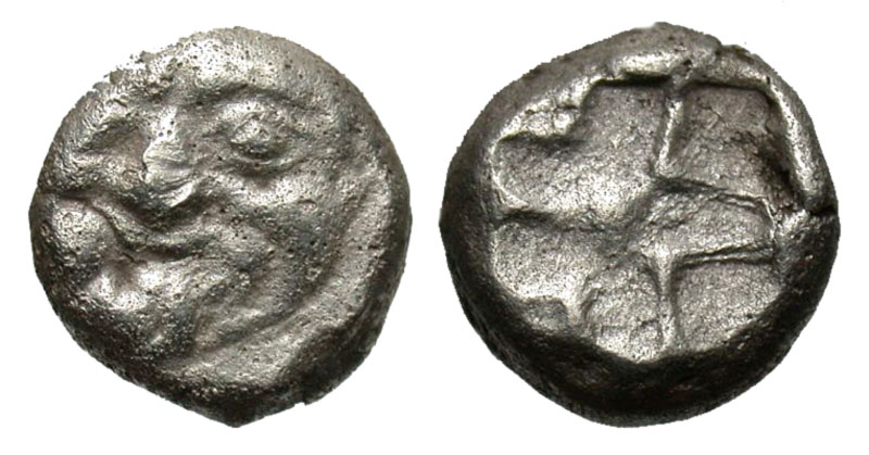 MYSIA, Parion. 450 BC. AR Drachm (3.18 gm). Gorgoneion facing / Incuse with cruciform pattern with pellet at center. SNG.Cop.256. Rosen.525v. VF. Scarce. [Est. $200.]