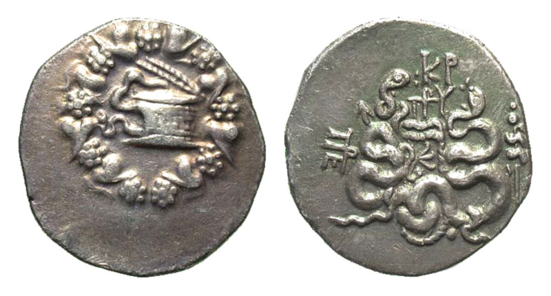 MYSIA, Pergamon. 133-67 BC. AR Cistophoric Tetradrachm (12.27 gm). Cysta Mystica / Two serpents coiled around bow-case, serpent-staff to right. SNG.Fr.1740. Toned VF+. [Est. $475.]