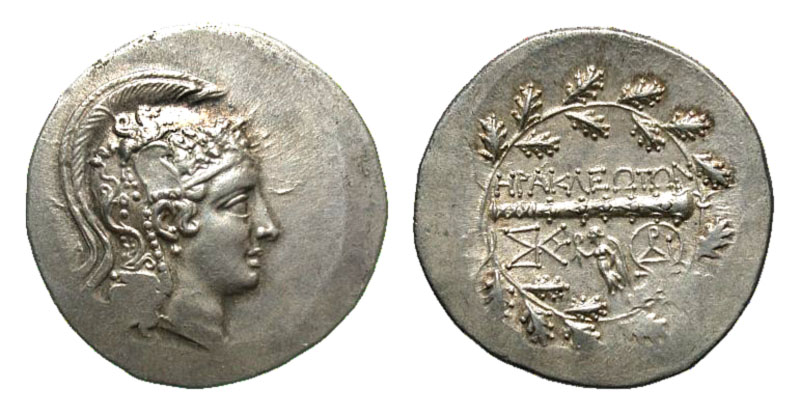 IONIA, Herakleia. 150-142 BC. AR Tetradrachm (17.26 gm). Head of Athena wearing crested helmet decorated with Pegasus / Club, Nike, and two monograms all within oak wreath. BMC.14.151.1 Toned XF. [Est. $3000.]