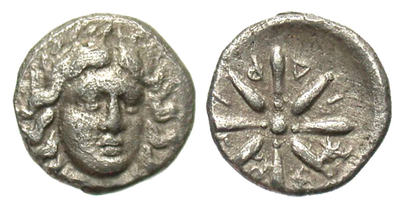 CARIAN DYNASTS. Hidrieos, 351-343 BC. AR Trihemiobol (0.80 gm). Head of Apollo facing slightly right / Stellate pattern. SNG.Turkey.888. Toned VF, light porosity. [Est. $250.]