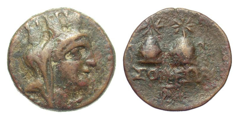 CILICIA Soloi. III-II Century BC. AE18 (5.95 gm). Turreted head of Tyche / Caps of the Dioscouroi. SNG.Lev.867. aVF, brown patina. [Est. $110.]