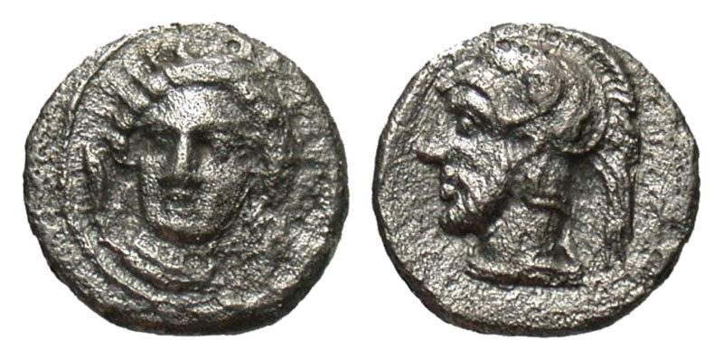 CILICIA, Tarsos. IV Century BC. AR Obol (0.71 gm). Facing female head / Helmeted head of Ares. SNG.Lev.93. VF+. [Est. $225.]