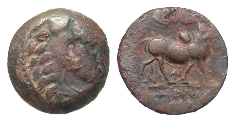 SELEUKID KINGDOM. Antiochos I, 280-261 BC. AE16 (3.33 gm). Head of Herakles in lionskin headdress / Bull walking. SC.441.2. VF, dark brown patina. Scarce. [Est. $225.]