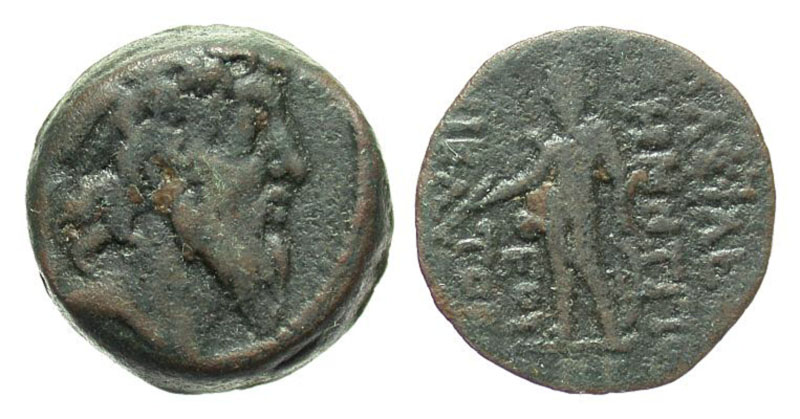 SELEUKID KINGDOM. Demetrios II, Second Reign, 130-125 BC. AE18 (5.40 gm) of 129/8 BC. Diademed bearded head / Apollo standing with bow and arrow. SC.2183. aVF, dark brown patina. [Est. $110.]