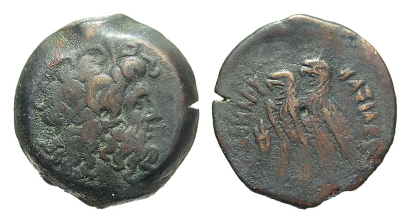 PTOLEMAIC KINGDOM. Ptolemy VI Philometor, 180-145 BC. AE32 Drachm (24.25 gm). Head of Zeus-Ammon / Two eagles on thunderbolt, cornucopia left. Svor.1424. Weiser.141 aVF, brown patina. Ex Charles Reeve collection, 1890-1930. [Est. $200.]