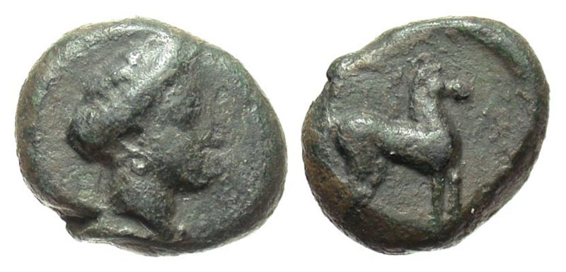 ZEUGITANIA, Carthage. IV-III Century BC. AE15 (4.45 gm), Sicilian mintAE . Female head right / Horse standing right. SNG.Cop.(Sicily).1029. VF, brown patina. [Est. $150.]