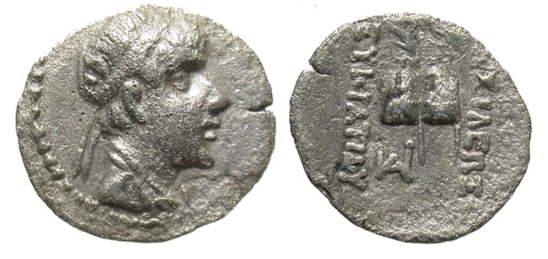 BAKTRIAN KINGDOM. Eukratides, 171-145 BC. AR Obol (0.58 gm). Diademed draped bust / Caps of the Dioskouri. SNG.ANS.454. Toned VF. [Est. $200.]