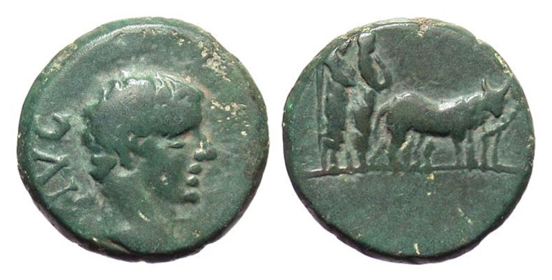 MACEDONIA, Philippi. Augustus, 27 BC-14 AD. AE17 (3.87 gm). Bare head right / Two priests plowing with team of oxen. RPC.1656. VF, attractive green patina. [Est. $150.]