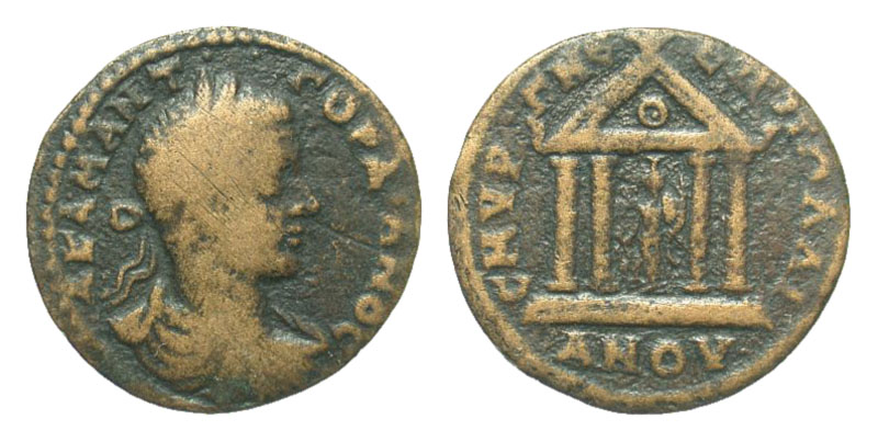 IONIA, Smyrna. Gordian III, 238-244 AD. AE25. (4.85 gm). Laureate dr. and cuir. bust / Tetrastyle temple, statue of Tyche standing within. SNG.vA.2229. SNG.Cop.1400var. Fine+, brown patina. Scarce reverse legend var. [Est. $135.]