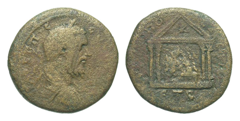 CAPPADOCIA, Caesarea. Septimius Severus, 193-211 AD. AE28 (14.22 gm), 194 AD. Laureate head / Mt. Argaeus within tetrastyle temple. Syd.431 var (distyle temple, date). Fine+, brown patina. [Est. $150.]