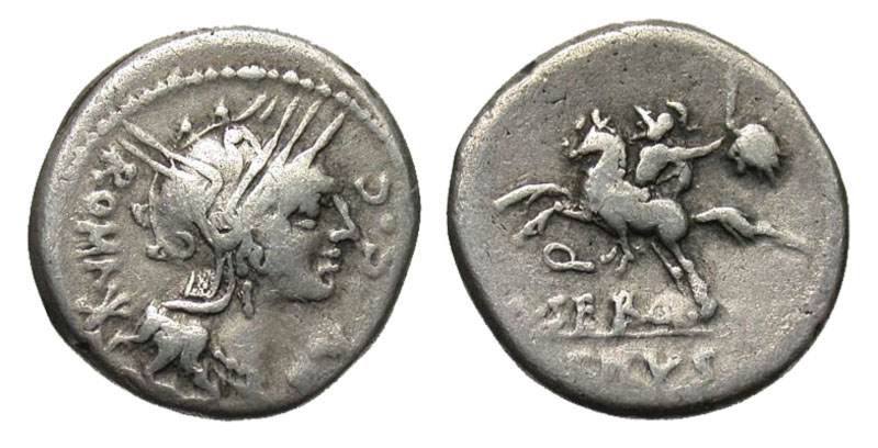 ROMAN REPUBLIC. M. Sergius Silus, 116-115 BC. AR Denarius (3.85 gm). Helmeted head of Roma / Horseman riding, holding sword and severed head. Cr 286/1. Sergia.1a. Toned aVF. [Est. $225.]
