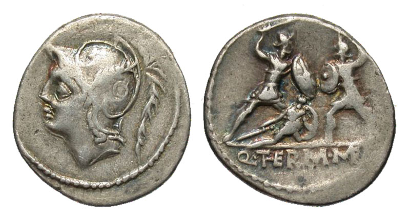 ROMAN REPUBLIC. Q. Thermus M. f., 103 BC. AR Denarius (3.97 gm). Helmeted head of Mars / Two warriors fighting; the one on the left protects a fallen comrade. Minucia.19. Cr.319/1. Toned aVF. [Est. $225.]