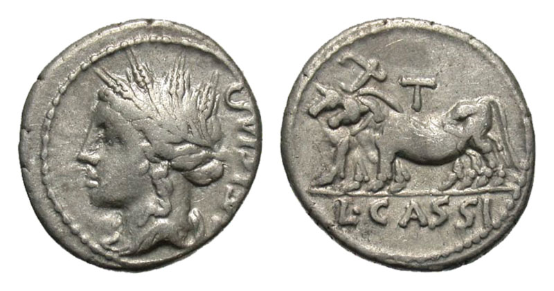 ROMAN REPUBLIC. L. Cassius Caecianus, 102 BC. AR Denarius (3.88 gm). Bust of Ceres / Two oxen plowing. Cr.321/1. Cassia.4. Toned VF. [Est. $325.]