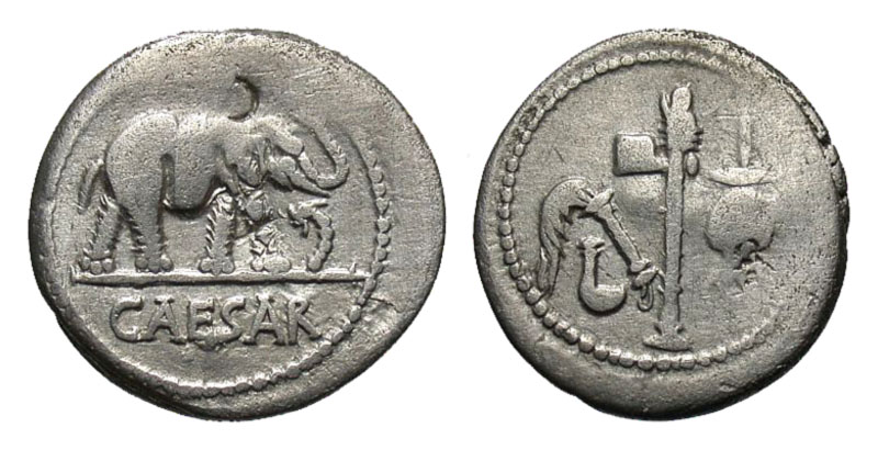 JULIUS CAESAR, Died March 15, 44BC. AR Denarius (3.67 gm). Elephant trampling serpent / Priestly implements. RSC.49. VF+, bm. [Est. $895.]