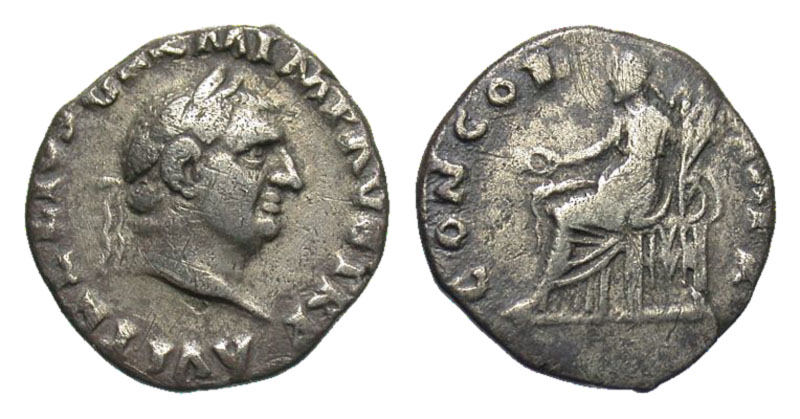VITELLIUS, 69 AD. AR Denarius (3.01 gm) of Rome. Laureate head / Concordia seated holding patera and cornucopia. RIC.90(S). Toned VF. Scarce. [Est. $750.]