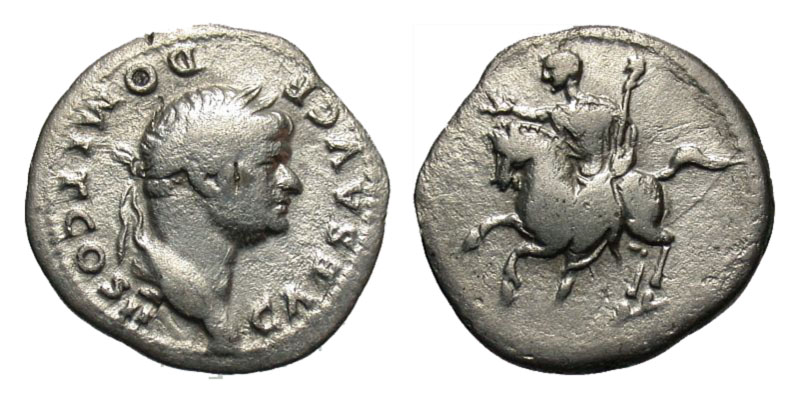 DOMITIAN, 81-96 AD. AR Denarius (3.02 gm) of Rome, as Caesar, 73. Laureate head / Horseman riding, hand raised. RIC.538(R2). aVF. Rare. [Est. $150.]