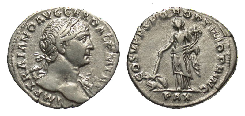 TRAJAN, 98-117 AD. AR Denarius (3.32 gm) of Rome 103-111 AD. Laureate head / Pax standing holding cornucopia. RIC.103. aXF. [Est. $250.]