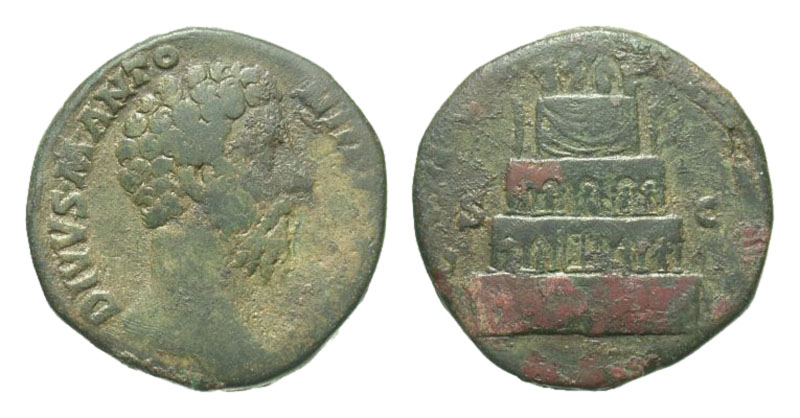 ANTONINUS PIUS, 138-161 AD. AE Sestertius (20.23 gm). posthumous commemorative under Marcus Aurelius. Bare head / Funeral pyre surmounted by quadriga. RIC.1266. aVF, olive green patina. [Est. $275.]