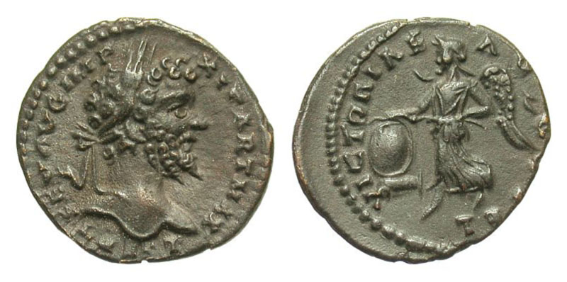 SEPTIMIUS SEVERUS, 193-211 AD. AE Limes Denarius (2.19 gm), 198-200 AD. Laureate head / Victory flying, shield on podium in front. cf RIC.144b. XF, dark brown patina. These AE denarii are thought to be base metal coins issued to troops on the front li