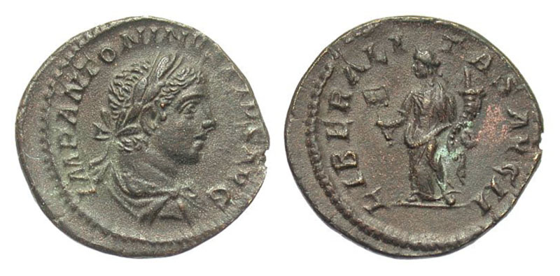 ELAGABALUS, 218-222 AD. AE Limes Denarius (2.25 gm). Laureate draped bust / Liberalitas standing holding abacus and cornucopiae. cf RIC.100. XF, dark brown patina. These AE denarii are thought to be base metal coins issued to troops on the front lin